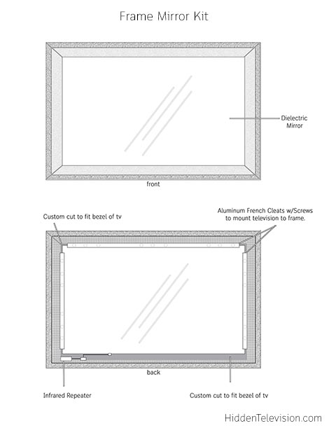 Frame mirror kit technical drawing shows how it fits over your television, turning it into a mirror TV.
